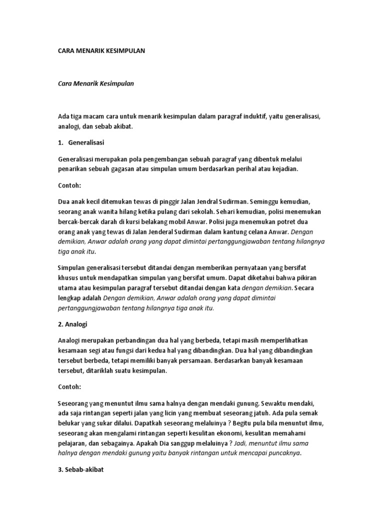 Menarik kesimpulan transitive verb Kita diajak untuk menduga-duga dan untuk menarik kesimpulan karena itulah yang kita lakukan dalam kehidupan nyata. Sebagai kesimpulan cara paling efektif untuk mencegah zoonosis virus adalah manusia harus menjaga jarak dari relung ekologis reservoir alami virus zoonotik. Ada tiga cara untuk menarik kesimpulan dengan penalaran induktif yaitu generalisasi analogi dan sebab-akibat.
